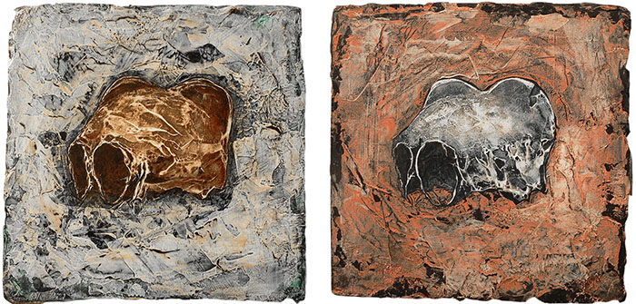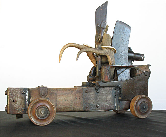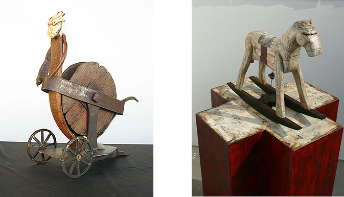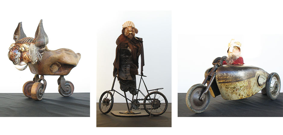 S’il est un lieu où les univers plastiques de Jac Vitali et Jean Médard se rejoignent, c’est sur le territoire des vanités. Crânes peints sur les cimaises et personnages hybrides, bringuebalants de l’exode où parfois même se mêlent au convoi des crânes d’animaux attifés de cornes et de plumes auraient trouvé leur place dans un cabinet de curiosité. Mais chez Jean Médard, la poésie de l’objet est teintée d’humour et de grotesque. L’art singulier et ludique de Jean Médard se fait démiurge d’un monde enfantin, de personnages assemblés d’éléments les plus divers : plumes, fragments de jouets, de moteurs, coquillages, bestioles empaillées, plumes… Mais, derrière la candeur de la scène pointe une ironie mordante sur l’orgueil des apparences et l’exode du temps. La fascination de ces êtres anthropomorphiques naît de leur vraisemblance quand l’œil à la recherche de repères et de certitude n’y voit qu’assemblages de débris de la nature glanés sur le sable des plages ou au hasard des brocantes. Assemblages disparates d’autant plus mystérieux quand ils s’exposent à notre regard derrière le vitrage de boîtes profondes; ils sont objets happés par la lumière du présent, exhumés d’un fonds poussiéreux de sorcellerie et de divination, débris d’autels de dieux disparus… Nous ne sommes pas loin des diableries à la Jérôme Bosch derrière lesquelles se cachent quelques secrets d’alchimiste. Face au spectacle de ces monstres et prodiges à la queue leu leu, bien malin qui peut dire la nature du cataclysme qui s’annonce… Ou qui a déjà eu lieu !