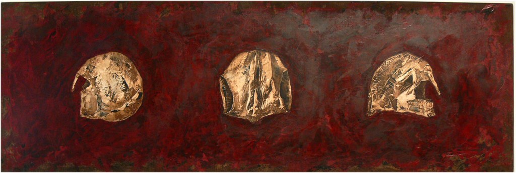Pari réussi que cette symbiose entre les assemblages de Jean Médard et les peintures et environnement sonore de Jac Vitali. Il faut dire que les deux artistes ne sont pas à leur coup d’essai puisqu’ils avaient déjà confronté leurs regards dix ans plus tôt dans les mêmes espaces de la galerie Socles et Cimaises de Desforges à Nancy. Les peintures ombrées de figures et crânes de Jac Vitali accompagnent au mur le défilé des créatures hétéroclites de Jean Médard, qui sont en route vers on ne sait quel exode. La proximité de ces « reliques carnavalesques » avec l’univers plastique et sonore de Jacques Vitali se révèle d’abord sous cet angle du magique, de l’envoûtement, de l' »enfoui ». Le titre des peintures de Vitali. est en soi révélateur : « masques », « apparitions », illumination ». L' »enfoui », il le touille, le remue en explorant les souvenirs d’enfance et bribes de mémoire où affleurent parfums évanouis, icônes phosphorescentes. C’était déjà le cas de travaux antérieurs comme « Chaman Hôtel » , métaphores de parcours oniriques dans l’espace et le temps Le son vient à la rescousse de ce qu’il décrit lui-même comme son rapport aux « fantômes » (il était musicien avant son travail de plasticien). Double parfait de son espace pictural, ses installations sonores sont une autre manière d’habiter le temps. Elles sont écho de mémoire intime, ou miroir onirique de voyages. En d’autres circonstances, sous forme de « performance » en lien avec une lecture public par exemple, ses manipulations sonores en direct sur bandes magnétiques associent frôlements métalliques, recouvrements, larsens et convoquent la mémoire auditive de chacun pour en débusquer l’intime, ou parfois la faille. Faut-il y voir pour l’artiste lui-même une forme d’exorcisme intime ?