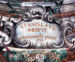 En 2007, le chantier de la restauration des peintures de l’église Notre-Dame de Bon-secours bâtie par Emmanuel Héré de 1738 à 1741, sanctuaire favori du roi Stanislas, allait soulevé quelques voiles. Il allait révélé la peinture du plafond de la chapelle des fonds longtemps attribuée à Provençal. Le nettoyage d’un cartouche (ci-dessous) dans un décor de la voûte en bordure de l’Immaculée Conception révélera sous plusieurs repeints l’association des noms de Stanislas et de Provençal. Fut-il le moment de gloire pour le peintre ? Parmi d’autres aléas de l’Histoire qui dispersèrent ses traces, citons enfin le destin de ses œuvres peintes pour le compte de la Chartreuse de Bosserville, près de Nancy : la chronique raconte que les Chartreux, victimes de la loi de 1901 sur les congrégations religieuses quittèrent Bosserville la même année, et trouvèrent refuge au monastère de Pléterje en Slovénie, emportant mobilier et tableaux (cité par Joseph Barbier, in La Chartreuse de Bosserville, grandeur et vicissitude d’un monastère lorrain, Nancy, 1991). Qui sait si des peintures de Provençal n’ont pas trouvé la-bas refuge ?