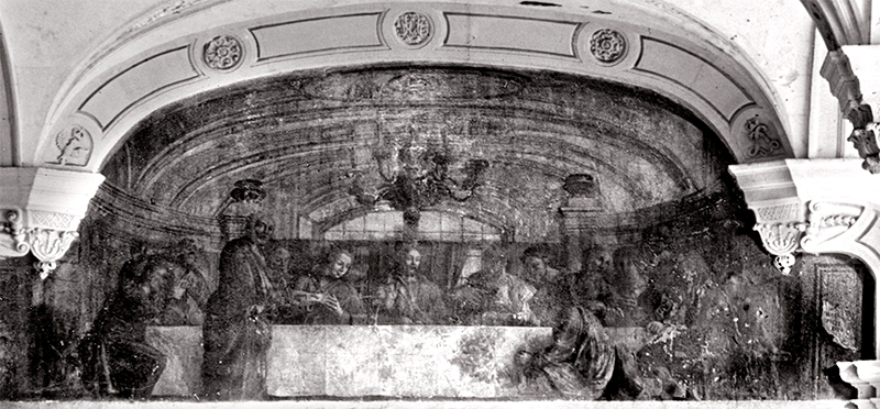 L’unique photographie noir et blanc retrouvée qui témoigne de cette époque nous permet d’identifier la fresque sur le mur du fond, dans la salle voûtée du réfectoire (photo de Mgr Kaltnecker publiée dans le Petit séminaire en 1958) . Qu’en était-il de sa beauté quand elle dominait l’assemblée des moines, sertie entre les consoles sculptées de la voûte ? On en devine l’ordonnancement de la table où se tiennent le Christ et les convives. Étrange impression que cette plongée dans une image désormais virtuelle… L’œil insatisfait aimerait dépasser cette barrière de l’espace et du temps… Un traitement de l’image a été confié au Conservatoire Régional de l’Image de Nancy-Lorraine qui restitue mieux la structure de l’œuvre : sur sa partie gauche, aux confins d’une obscurité irréelle émerge plusieurs silhouettes de part et d’autre de la table dressée. Conformément à l’iconographie chrétienne, serait-ce donc Pierre, étrangement barbu debout, au centre, le regard tourné vers nous, et Judas, prostré un peu à l’écart à gauche ?