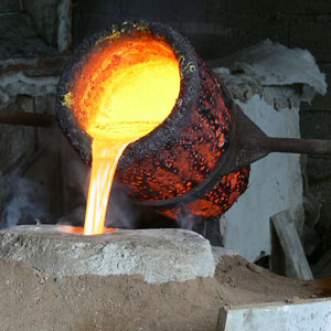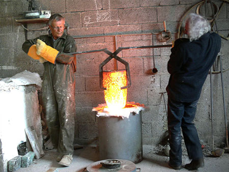L’étape particulière de la coulée s’inscrit dans un long et lent processus qui suit le modelage dans les mains de l’artiste de la forme sculptée en cire. Cette intervention en amont scelle la connivence initiale entre le geste créateur de l’artiste et la matière première. Elle sera suivie de beaucoup d’autres avant que le sculpteur ne révèle enfin son œuvre aboutie à notre regard. La sculpture « fondatrice » en cire, cernée de sa gangue de ciment, a été soumise à la chaleur d’un four. La cire fondue s’est retirée jusqu’à la dernière goutte, générant un creux que devra remplir le bronze en fusion, jusqu’aux moindres recoins. Pour l’heure, à nos pieds sous un dôme de sable, la sculpture en gestation est un réceptacle vide affublé de drains et d’évents, comme meurtrie avant de naître douloureusement au monde. Simple spectateur, je ne peux que m’imaginer ce corps en creux, enfoui tel un secret dans son sarcophage. Je suis convié à ce moment crucial de la coulée du bronze fondu dans le moule encerclé de ciment réfractaire. Le métal en fusion instillera alors la vie grâce aux évents qui permettent à la fois d’évacuer l’air et d’irriguer toutes les anfractuosités du creux. Cet instant scellera enfin dans la chair du métal la lente et progressive complicité d’une pensée avec le matériau. La manœuvre est délicate car il faut déverser du godet le métal fondu porté à plus de 1200°C dans l’étroit cône à la verticale du moule. L’artiste est, cette fois encore, assisté du fidèle Bernard, dans une connivence de gestes précis et coordonnés, que tous deux connaissent bien pour les avoir effectuer maintes fois.