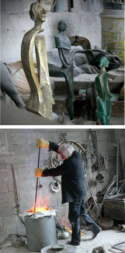 L’antre de l’atelier en impose par la hauteur de sa voûte. Son pourtour est encombré d’outils, de matériaux et machines où quelques sculptures anciennes se dressent sur le périmètre de la scène à venir, indifférentes à l’artiste qui, dans un coin, alimente de vieux bronzes de récupération le feu infernal du four.
