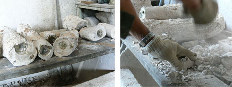 Le sculpteur est l’instigateur et le témoin d’un grand œuvre au processus long et épuisant, qui nécessite une somme d’expérience et de savoir-faire dans l’univers de l’air et du feu, avec l’éventualité de l’échec, même minime, qui ne peut être écarté. Mais on ne peut pas parler d’ingratitude à propos de ce diktat de la matière et de ses lois, car la récompense est immense quand la sculpture émerge des scories de ciment. Sur l’étagère, les moulages de ciment blanc ont l’apparence étrange de vieux obus rouillés en attente de mains expertes. Mais leur désintégration apportera non la mort, mais un gage d’éternité chargé de vécu et de passion.