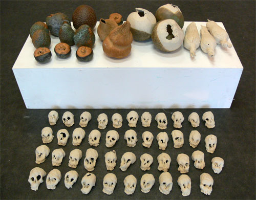 Au centre de la galerie, une présentation de sculptures en céramiques modelées de la main de l’artiste complète l’exposition murale : des fruits, noix de coco, et l’épi de maïs, emblème ancestral de la vie. Mais le regard d’artiste qu’Isabelle Pierron porte au Mexique, tel un hommage à ce pays lointain, serait incomplet s’il ignorait que là-bas les murs ne sont pas maculés que de peinture mais hélas quelquefois de sang. Quarante trois crânes de grès sont alignés sur le sol de la galerie à la mémoire des élèves-enseignants de l’école normale d’Ayotzinapa assassinés à Iguala dans le bus qui les transportait.