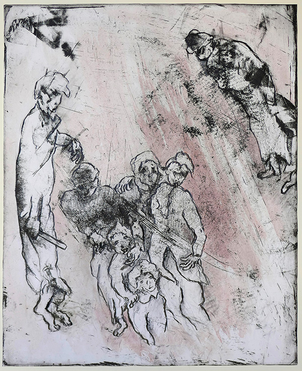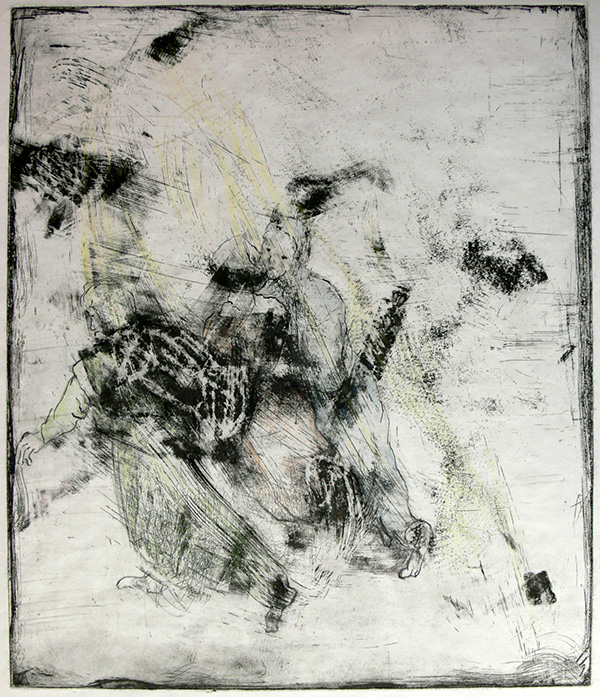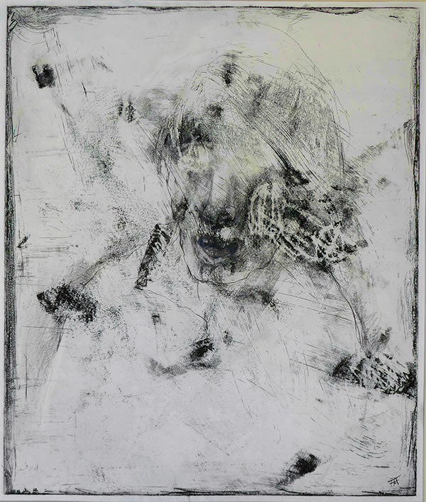 Que ma propre subjectivité traduise en une série de dessins un tel univers à vif ne pouvait souffrir d’aucun pittoresque ni fioriture. Je disposais d’un matériau brut : j’ai l’habitude de garder les moindres épreuves d’essai de mes suites gravées antérieures. Ce sont de simples feuillets de papier qui témoignent des premières morsures à l’eau-forte, encore anarchiques, d’une l’estampe en devenir. Sortis de leur contexte créatif, des années plus tard, ils font office de palimpseste. Sous un regard vierge et neuf, ils sont des ferments d’images nouvelles, aptes à recueillir la décantation lente d’une lecture.