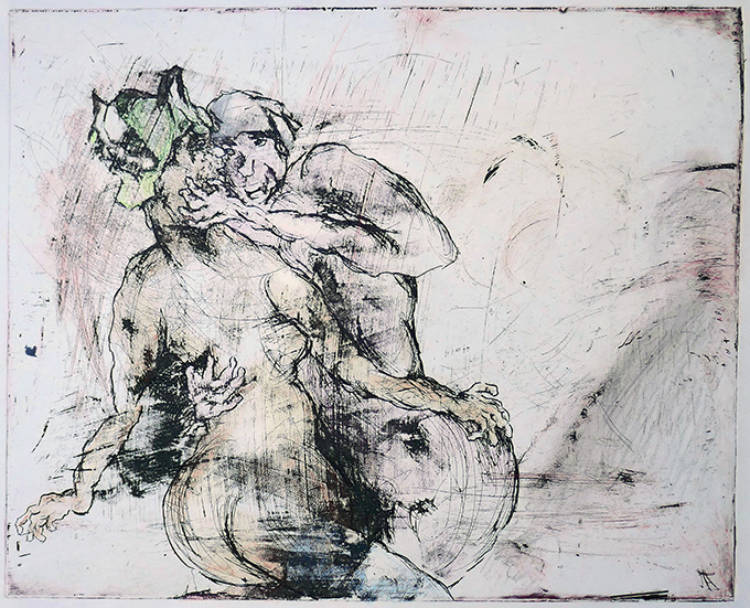 Je présente ici ces images issues de ma lecture de Berlin Alexanderplatz, dessinées à l’encre ou à la mine de plomb sur ces états gravés anciens, parfois rehaussés de couleur. Et puis, j’avais délaissé ces dessins remisés dans un carton, accaparé par d’autres projets graphiques, et plongé dans de nouvelles lectures. J’ai eu peu d’opportunités ou, à vrai dire de motivation profonde, à « illustrer » une œuvre littéraire. J’ai tenté l’expérience avec La Divine Comédie de Dante, sous forme d’une suite de gravures à l’eau-forte sur cuivre. Je trouve que c’est un exercice difficile tant il est malaisé de trouver la bonne distance entre son exigence de liberté graphique et un univers romanesque ou poétique par nature très prégnant.