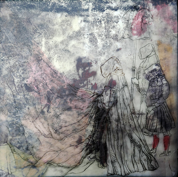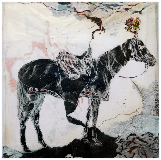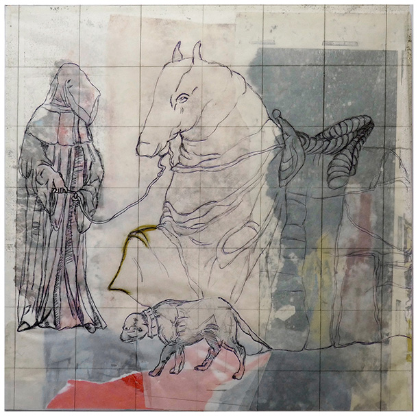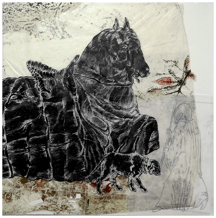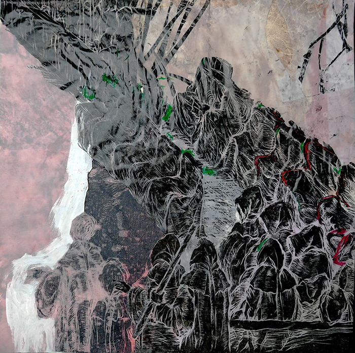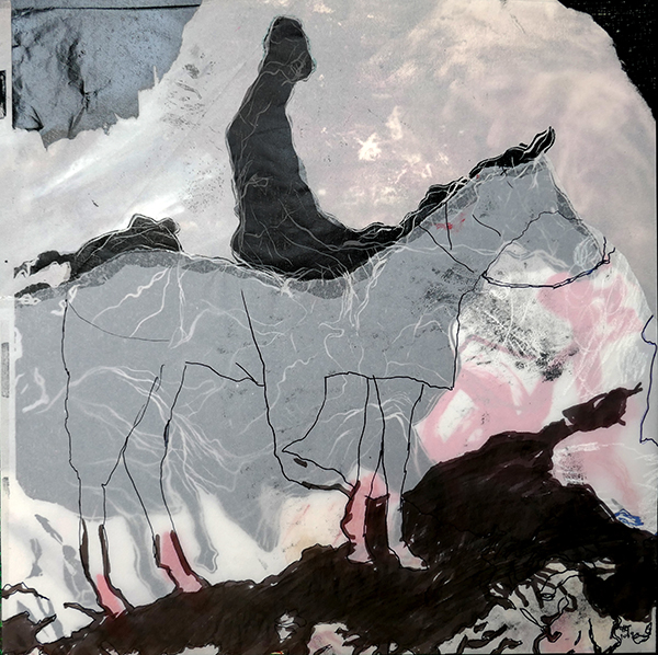 compositions d’après gravure sur vinyl avec calques, collages, pastel / chacune 50 x 50 cm.