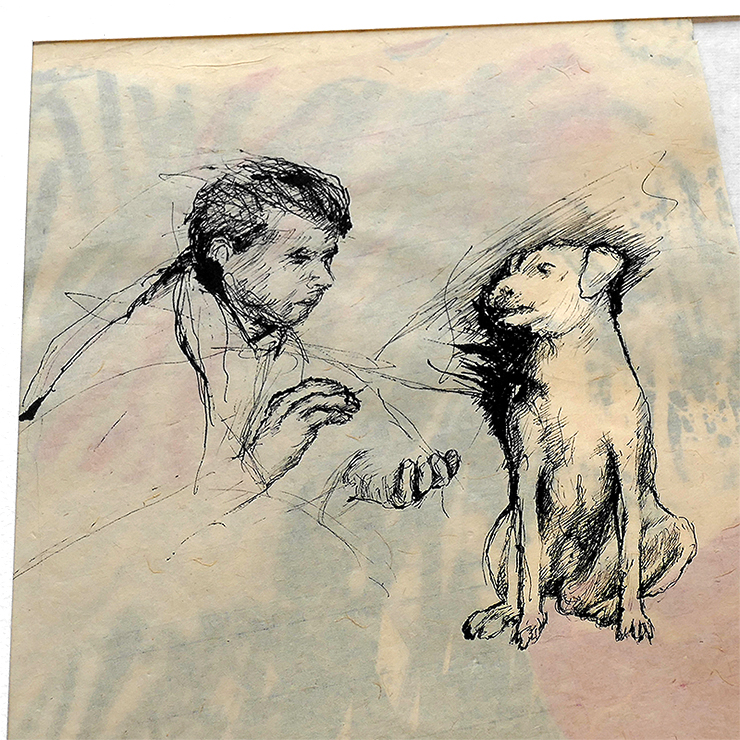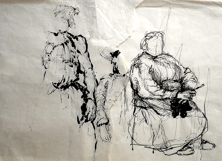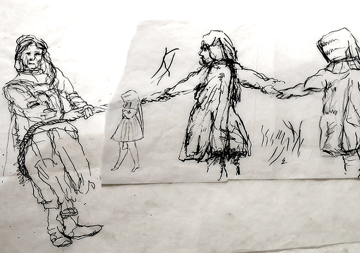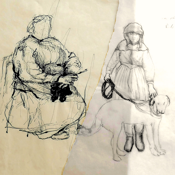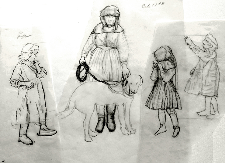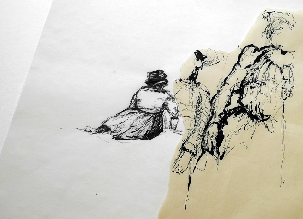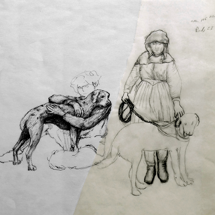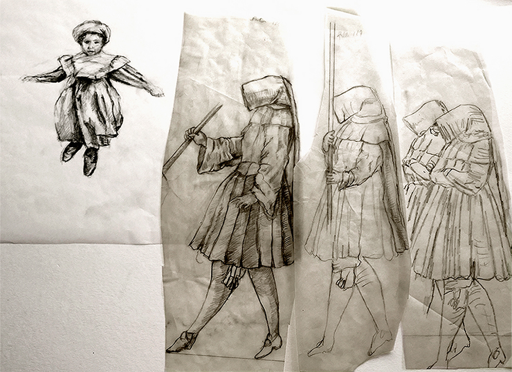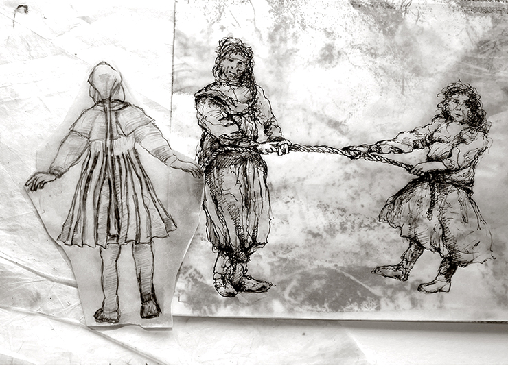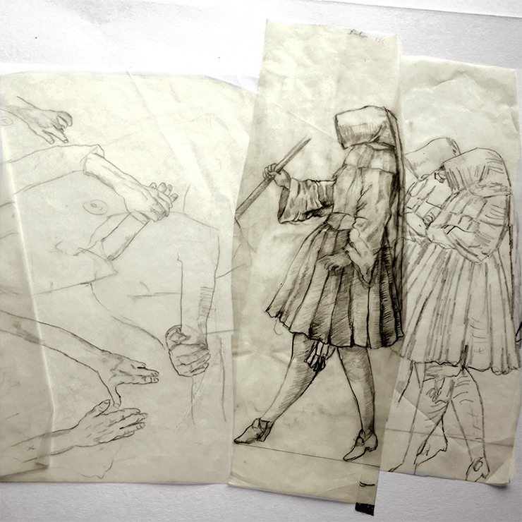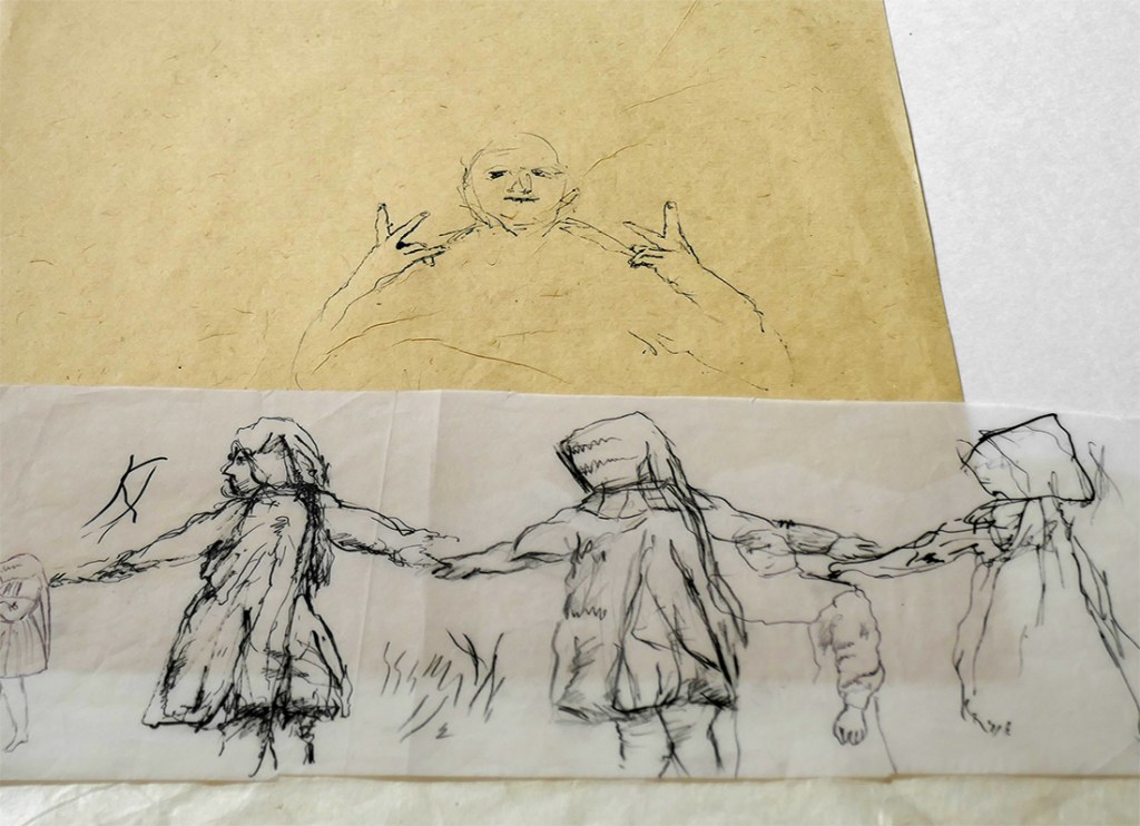 Les illustrations présentées donnent idée de ce travail en cours. Elles témoignent des essais multiples, des affinités possibles entre motifs, mais qui ne présagent pas forcément du choix final qui sera fait. Fidèles à ma démarche, ils s’inscrivent dans un souci d’organisation visuelle où s’entremêlent mythologie personnelle et figuration, avec une prédilection pour le support calque qui permet de jouer avec la coloration résiduelle des fonds.