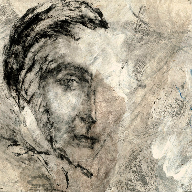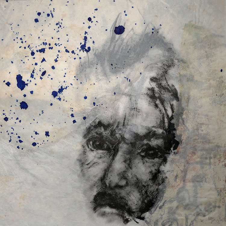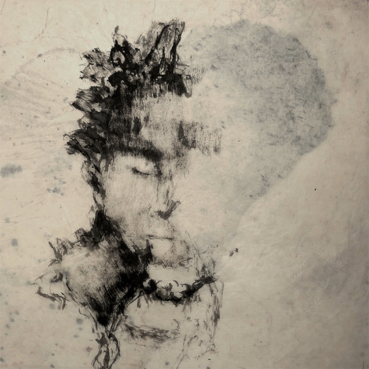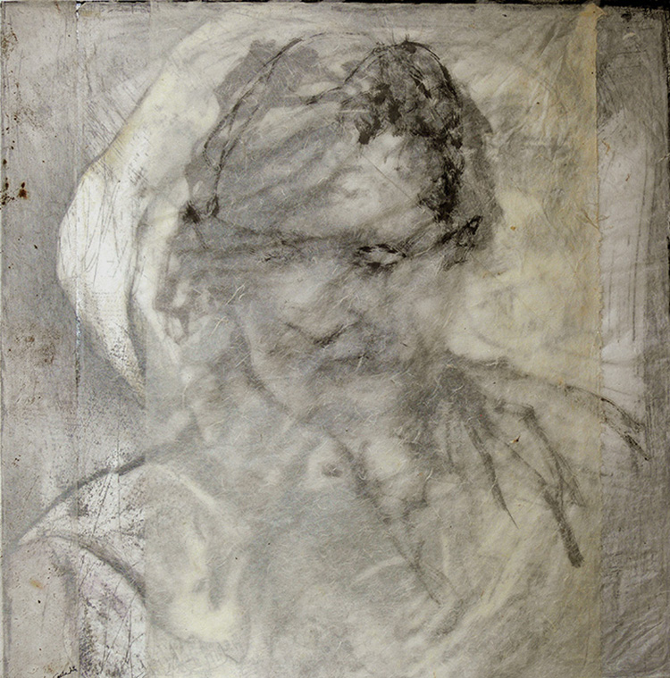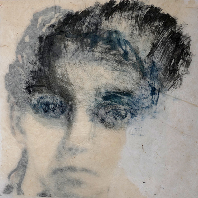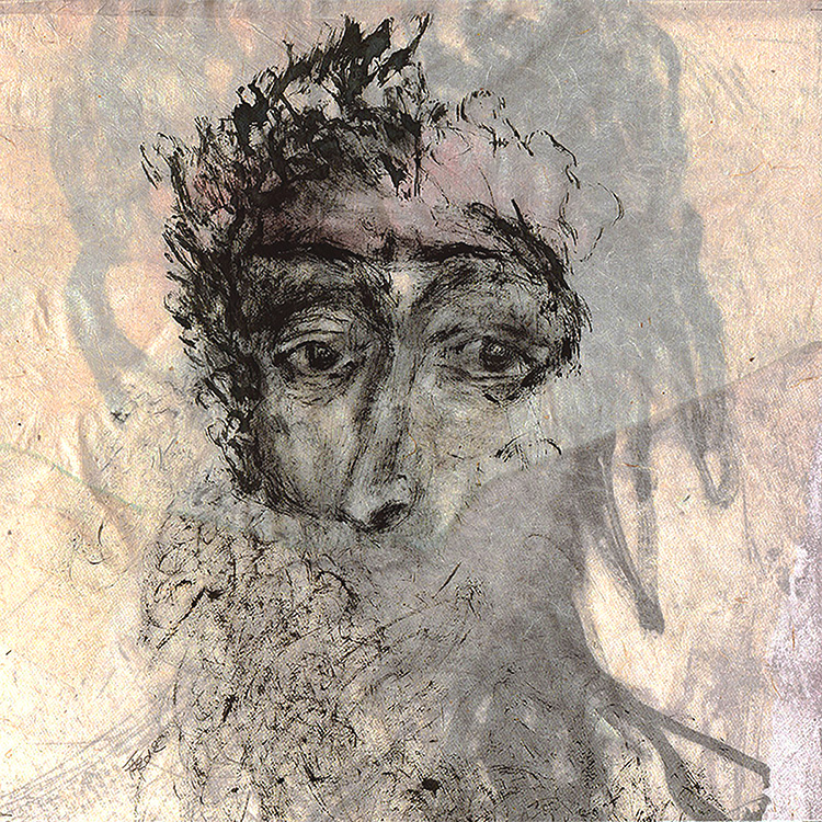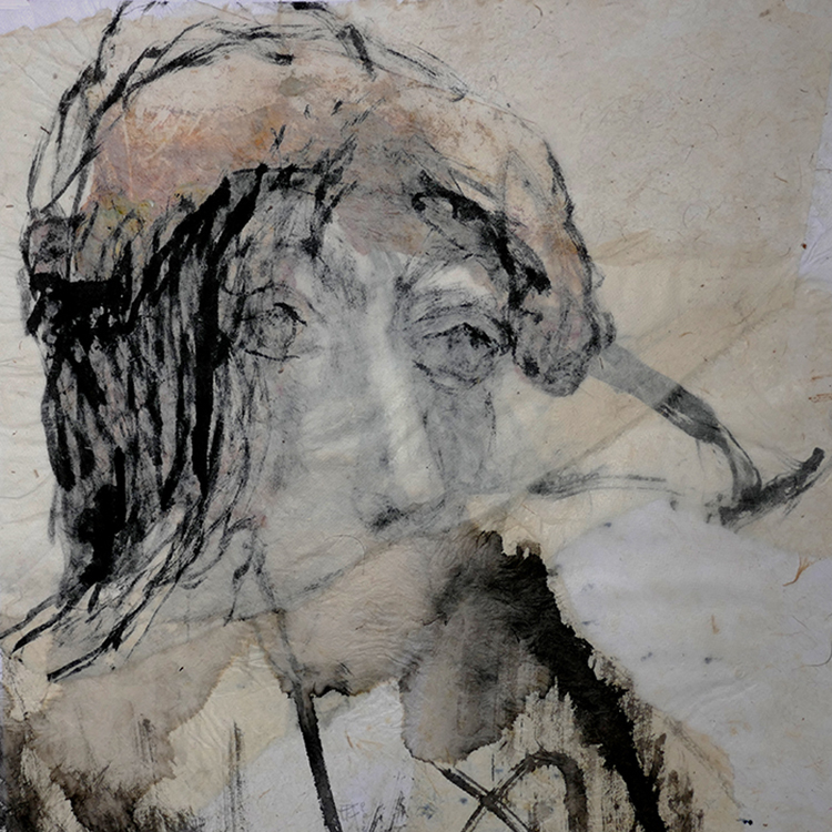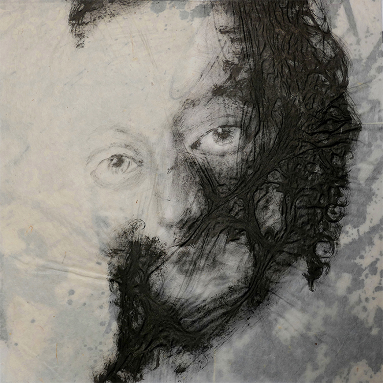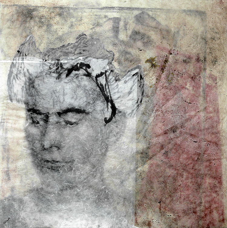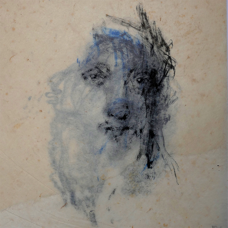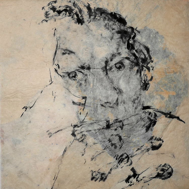 J’ai accordé dans ces travaux graphiques une grande importance au support papier. La structure du visage de référence n’est rassemblée et suggérée qu’en quelques traits fugaces à l’encre de Chine sur un léger papier oriental translucide. Elle est comme “captée“ en un geste rapide du pinceau sur cette fine épaisseur de peau de papier, qui, sera, elle-même par la suite, superposée à d’autres épaisseurs sous-jacentes travaillées par pigments ou collage. À la fugitive présence initiale s’agglutinent et se superposent d’autres strates graphiques qui viennent à la rescousse d’un portrait toujours vain.