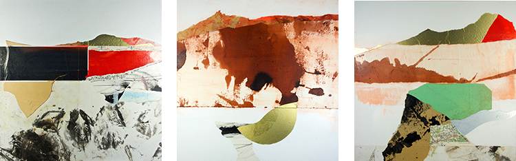 À défaut d’un geste du destin, comment ne pas voir dans ces circonstances personnelles, au retour de ces voyages, un appel à l’imaginaire du peintre et du sculpteur dans le laboratoire de l’atelier. L’imaginaire se nourrit de telles opportunités; pour faire germer des réminiscences de mémoire avec les rescousses de l’acrylique, de parcelles de papiers, ou autres fragments d’acier et de bois… Sans doute fruit d’une lente maturation pour traduire en couleurs et formes les vastes étendues ocres de terre et les filets verts qui les protègent de l’érosion et des tempêtes. Ou bien les reflets d’or entrevus dans un monastère taoiste et bouddiste, les terres cuites de l’armée fantôme de Xi’an ou les drapeaux de prière multicolores bercés par le vent aux portes du Tibet. Tout était désormais disponible pour le travail d’atelier : les milliers de photos rapportées des voyages, les souvenirs et impressions enfouies, les richesses humaines des rencontres, et les fragments de papier retrouvés dans la malle.