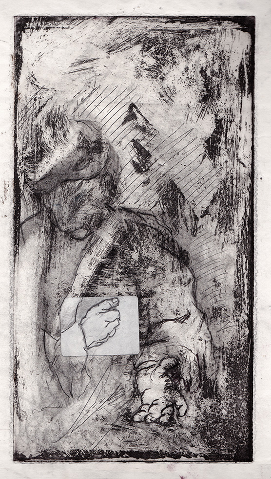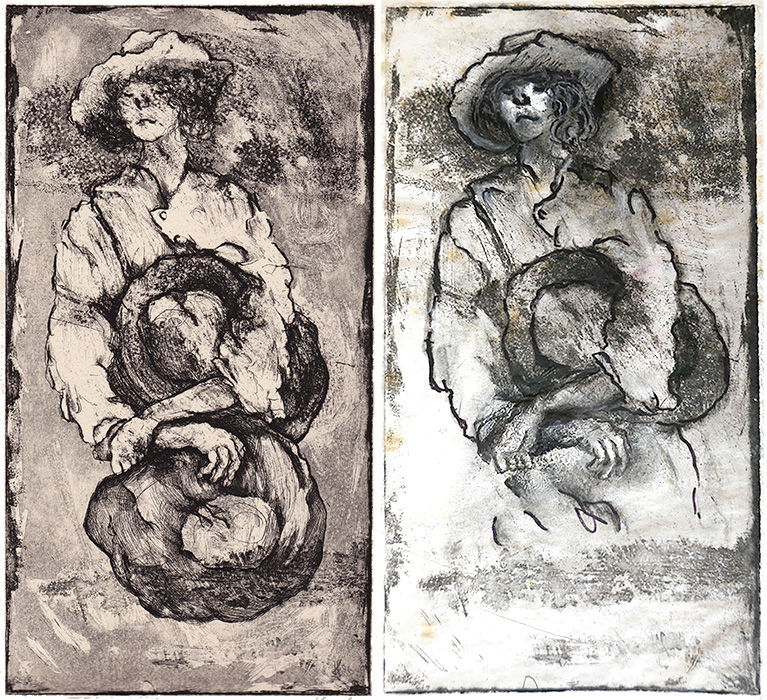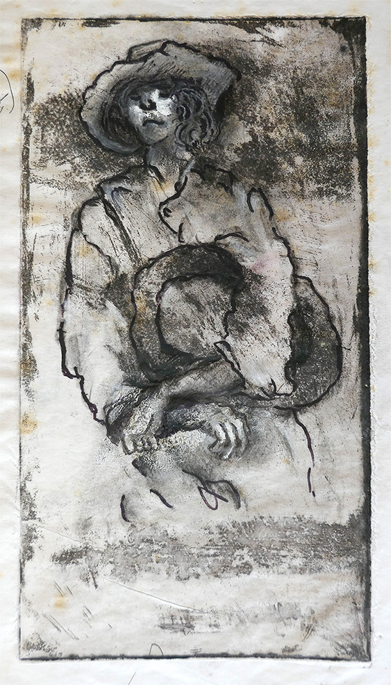 La suite Varie Figvre, gravée à l’eau-forte sur cuivre est constituée de neuf portraits en pied différents , dont cinq furent réunis en un coffret de couleur grenat. Un état préparatoire des compositions était joint aux premiers exemplaires. Mon propos était de représenter des « figures variées », gentilhommes et mendiants, inspirées de l’univers de Jacques Callot. Chaque personnage n’est pas né d’un dessin préconçu sur page blanche, mais s’est constitué à partir du désordre informel d’un premier état de morsure, à partir duquel, d’état en état, s’est révélé un personnage structuré au trait de fusain ou de pastel, avec au besoin des rajouts de collage. Je présente ci-dessous deux exemples de ces premiers états (cliquer sur l’image).