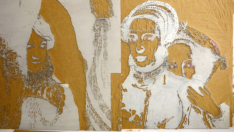 ci-dessus et en bas à droite : la planche gravée en cours de réalisation, format 50 x 50 cm, année 2021.
