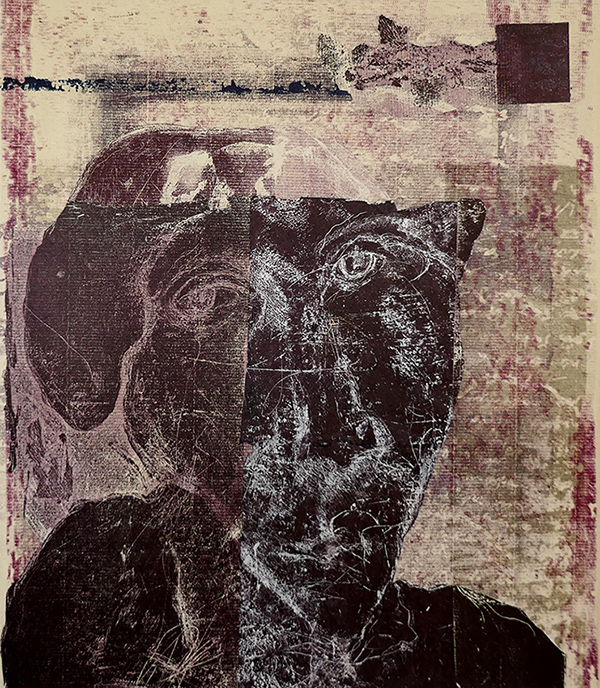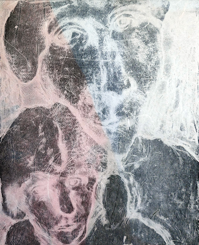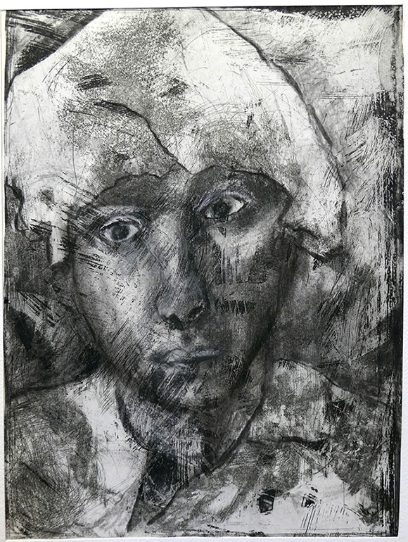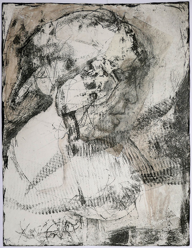 crayon, collage et fusain sur état gravé, format 24 x 32 cm.
