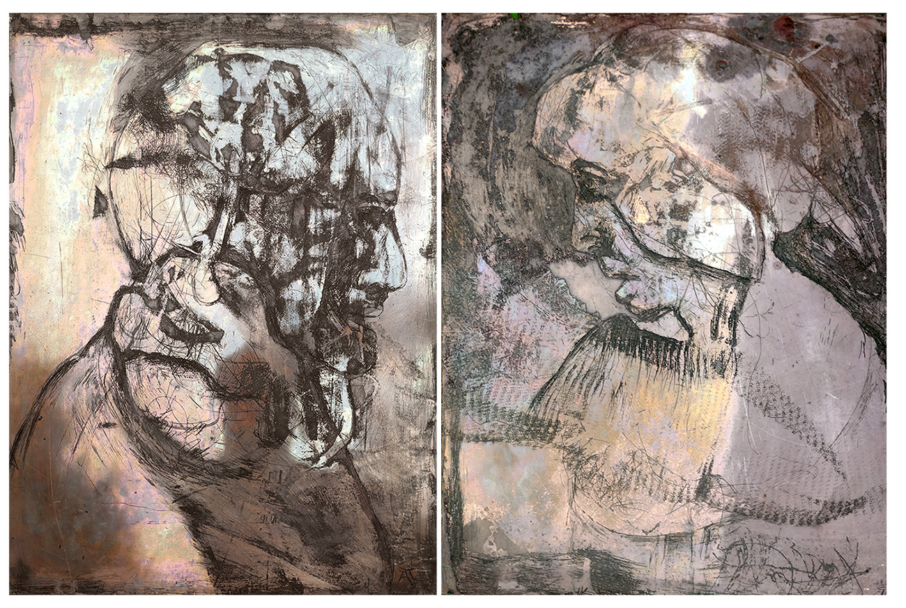 Ce coffret rassemble onze variations à exemplaire unique sur la thématique du portrait. Elles ont pour base de travail des états de tirage de plusieurs portraits gravés sur cuivre à l’eau-forte et aquatinte, d’un format moyen de 30×24 cm.