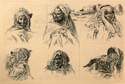 Ainsi il inséra dans son recueil la planche entière constituée des six portraits délimités par un trait de coupe (voir ci-dessus) avant de fractionner sa plaque de cuivre et tirer en remarques certains portraits isolés. Il est fort probable que ces remarques sont la part la plus spontanée de son travail graphique sur le motif, jetant en quelques traits de pointe sur la plaque l’esquisse d’un motif qu’il pourra au besoin compléter à l’atelier dans des compositions plus élaborées. C’est en soi une variante de l’épreuve dite de remarque dont les marges et les blancs comportent des croquis qui, en principe chez les graveurs, étaient effacés avant l’épreuve définitive.