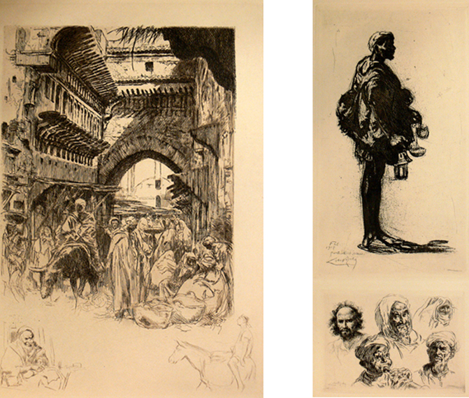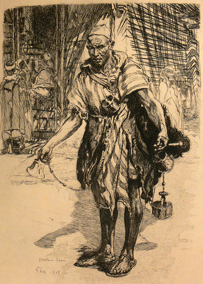 Cette gravure de porteur d’eau légendée Fès 1918 témoigne d’un beau velouté de noir d’aquatinte visible aussi dans beaucoup de gravures du recueil Arabesques intimes. Dans ses scènes de rue, paysages et portraits rapportés de la ville de Fès et de sa région proche, le regard de Lobel-Riche est loin de l’orientalisme fantasmé propre à beaucoup d’artistes composant ce qui n’est pas un courant pictural.