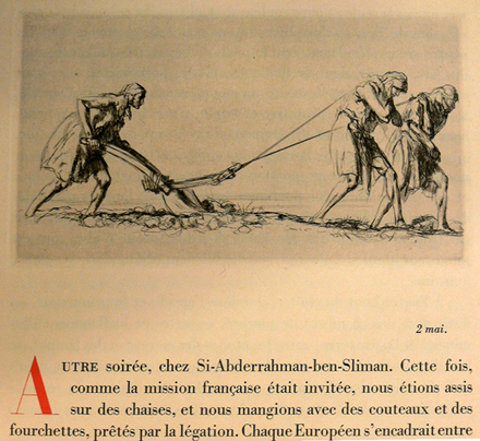 La biographie du peintre-graveur (*) permet de reconstituer la genèse des illustrations de cet ouvrage. Lobel-Riche avait été incorporé en 1914 comme lieutenant dans l’Armée d’Orient. Mais après avoir été atteint du typhus, il passe les six derniers mois de la Grande Guerre au Maroc aux côtés du maréchal Lyautey. Il rapportera de ce séjour au Maroc, sous protectorat français depuis six ans, nombre de dessins et gravures qui serviront plus tard à illustrer Crépuscule d’Islam. Tous ces dessins ont été réalisés d’après nature sans perturbations fantasmatiques même si le cadrage choisi par le graveur élimine les éléments déjà présents de ce qui sera perçu comme modernité. Montrer ainsi une charrue tirée par deux hommes (ci-dessus), c’est choisir une scène exceptionnelle. Normalement, la charrue est tirée, même en 1905, par un camélidé associé à un équidé. Mais la scène montrée, imposée par la dureté du temps (la crise de Tanger de 1905), a existé. Toutefois cette image est d’autant plus curieuse que le texte situé juste sous l’image décrit un repas chez un notable marocain utilisant, pour faire plaisir à ses invités, chaises, couteaux et fourchettes, dont l’usage ne se diffusera au Maroc qu’au XXe siècle.