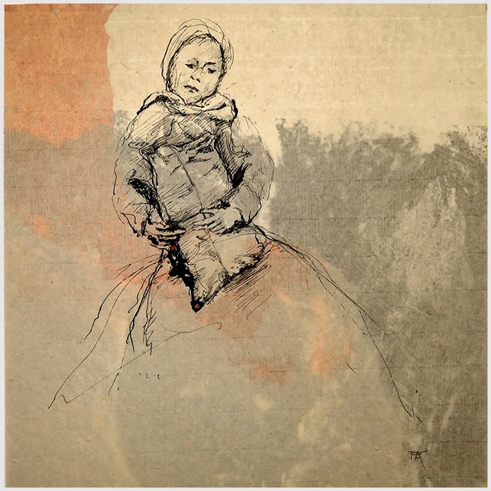 Ces quelques croquis, parmi d’autres, que je présente ici, sont à considérer comme des exercices graphiques d’un vagabondage autour de ce regard lointain, qui a heurté mon propre regard. Ici, pas de trait minutieux de dentelle ou de tissu précieux, mais le parcours indécis d’une plume ou d’une pointe de calame trempée dans l’encre de Chine, à la recherche d’une consistance de forme qui n’a obéi qu’un un seul précepte formel : commencer le dessin par un tracé des yeux, ouverts ou fermés, et tout autour de ce point d’ancrage, dérouler d’un trait noir fugace et incertain la mémoire d’une silhouette d’enfant princesse et duchesse croisée un jour dans un musée.