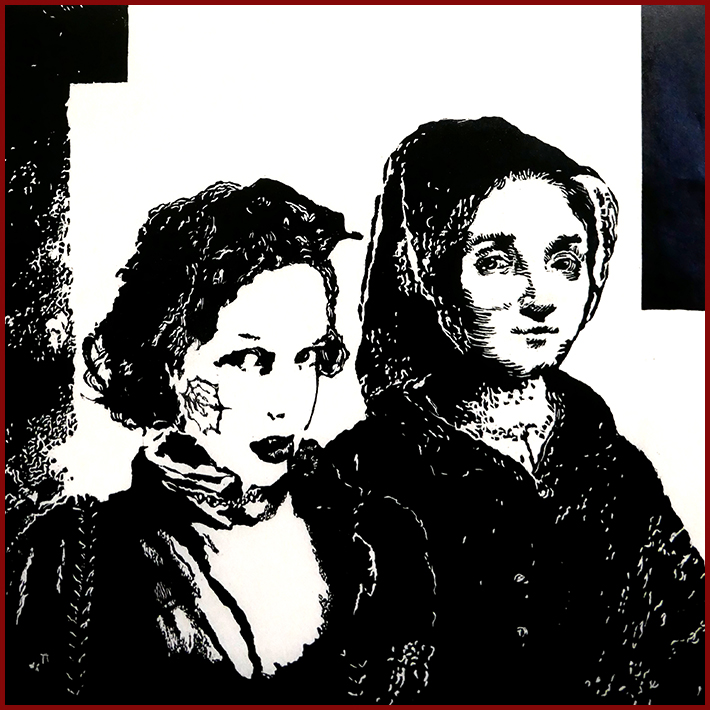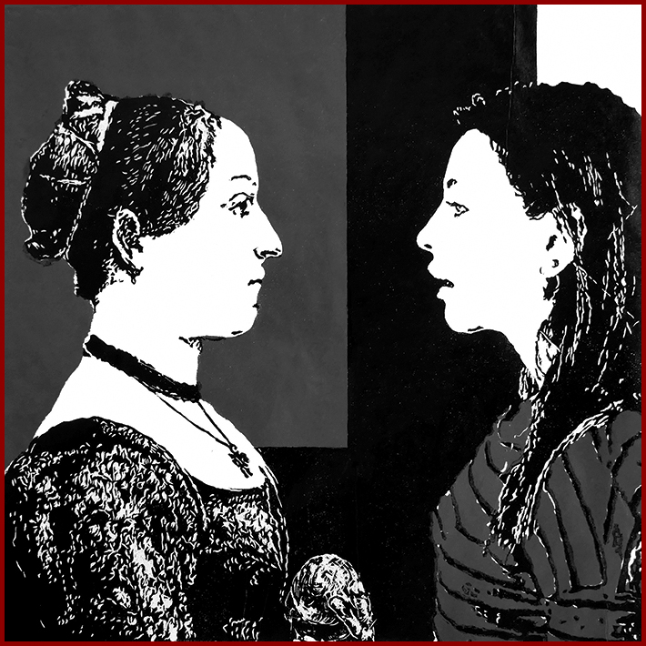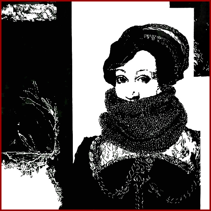Ces quelques croquis, parmi d’autres, que je présente ici, sont à considérer comme des exercices graphiques d’un vagabondage autour de ce regard lointain, qui a heurté mon propre regard. Ici, pas de trait minutieux de dentelle ou de tissu précieux, mais le parcours indécis d’une plume ou d’une pointe de calame trempée dans l’encre de Chine, à la recherche d’une consistance de forme qui n’a obéi qu’un un seul précepte formel : commencer le dessin par un tracé des yeux, ouverts ou fermés, et tout autour de ce point d’ancrage, dérouler d’un trait noir fugace et incertain la mémoire d’une silhouette d’enfant princesse et duchesse croisée un jour dans un musée.