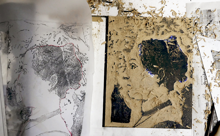 Jean-Charles Taillandier, « Chut ! » Inspirée d’une peinture d’Antonio Moro, « Portrait de Catherine de Castille« , XVIe siècle, Musée du Prado, Madrid. xylographie 50 X 50 cm, année 2021. ci-dessus et en bas à gauche : la planche gravée en cours de réalisation, format 50 x 50 cm, année 2021. ci-dessous à droite : tracé d’une prochaine gravure de la série.