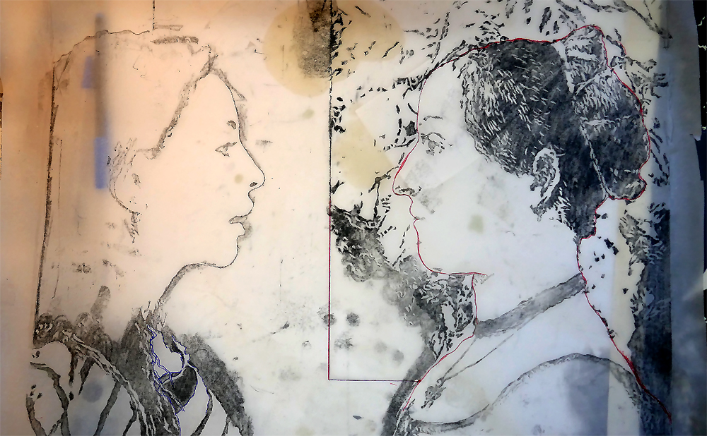 Jean-Charles Taillandier,« Entre Elles-4 , Double portrait à la pomme ». Inspirée d’une peinture Renaissance italienne (?) », xylographie 50 x 50 cm, 2 couleurs, année 2021. Précédée de trois étapes de son évolution.
