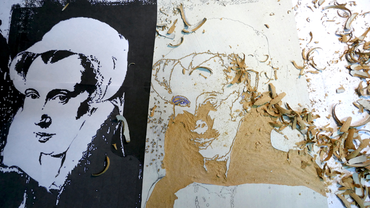 Toujours dans le domaine du portrait, la seconde série gravée Portraits d’outre-temps a été amorcée dès l’été 2022. L’article précédent en a fait largement écho. Aujourd’hui, la série, désormais close, compte seize planches différentes gravées sur dalles vinyl, au format 30×30 cm. La prochaine étape sera leur tirage sur un papier artisanal, en deux couleurs noire et rouge et pour un nombre d’exemplaires limité encore indéterminé.