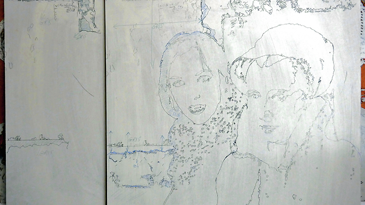 Ci-dessous : le visage de femme d’un autre temps est inspiré d’un portrait de femme peint par Frans Pourbus l’Ancien (1578), conservé au Musée de Grenoble. La mise en place de la scène fait là encore l’objet d’un croquis à la mine de plomb et stylo. Le regard de surprise est jeté cette fois-ci par la jeune femme contemporaine qui arrive à sa hauteur par l’arrière. J’ai commencé par graver le portrait de la femme ancienne, en soulignant sa différence par l’aplat gris de son manteau, que je matérialiserai par une seconde planche gravée.