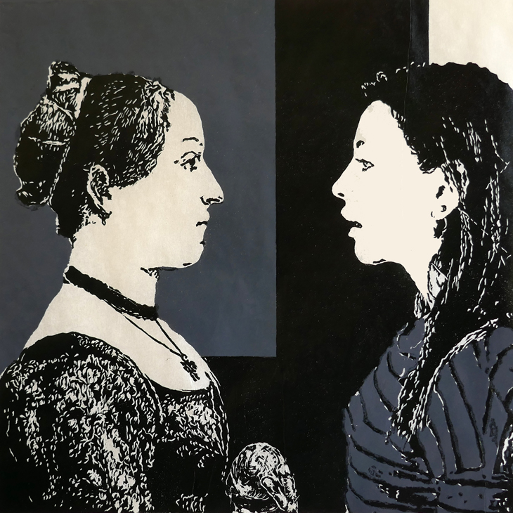 Jean-Charles Taillandier, » Entre Elles 10 – Face à face « , xylographie 50 x 50 cm, année 2022. source : Peinture Ecole flamande, Dame Bonne d’Artois, stadtliche Museen, Berlin.