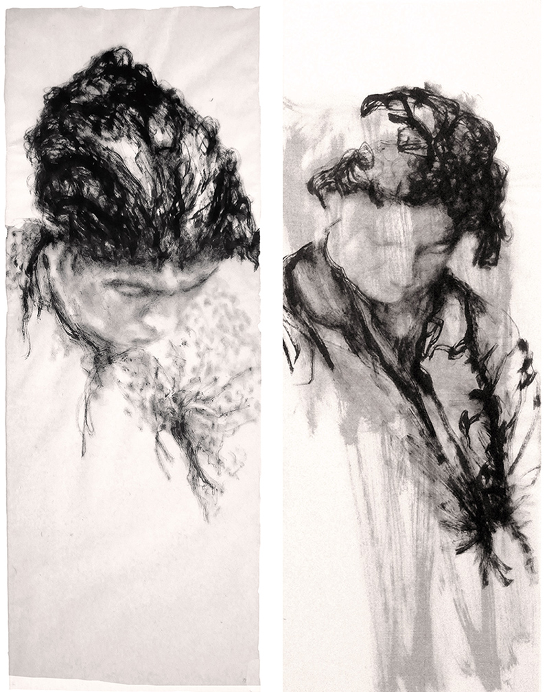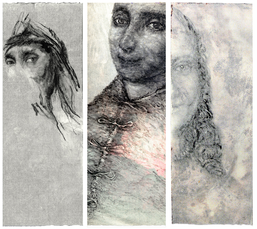 Jean-Charles Taillandier – Encres sur papier oriental, avec collages, format 60 x 22 cm. au centre : d’après Portrait de Florentine de Fulaine, religieuse (XVI-XVIIe siècle)- Musée de la Cour d’or, Metz. à droite : d’après Portrait de jeune fille (première moitié du XVIIe siècle). Attribution incertaine (Matthieu Le Nain ?) – Musée Georges de la Tour, Vic-sur-Seille.