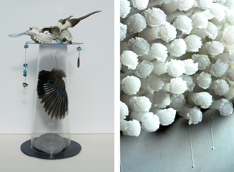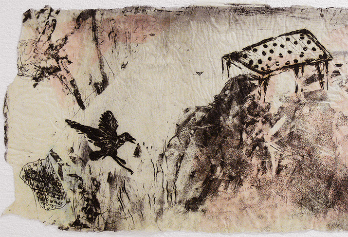 Mon travail gravé, dans le rouleau, accueille aussi la présence de l’oiseau. Elle s’actualise d’une relecture poétique et vivante, confrontant la matière volatile de toute vie à la pesanteur du destin et des éléments. De multiples motifs hermétiques se répètent et dialoguent tout au long de ce déroulé imaginaire. Devenu irréel et poétique, cet univers amène d’autres questionnements à notre monde contemporain auxquels participe le langage plastique (assemblage papier-image-couleur-texte-affabulation)…