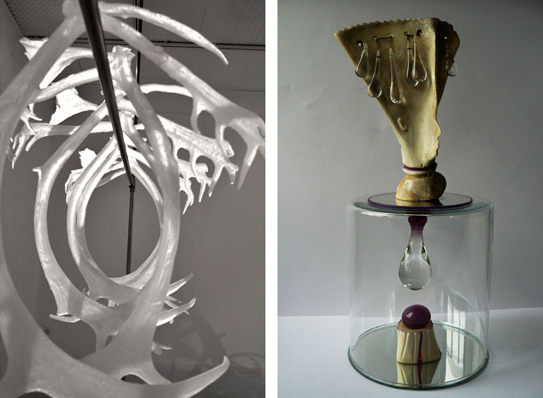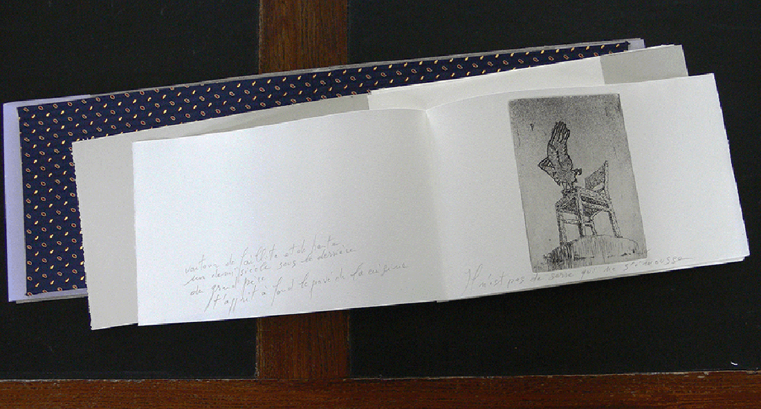 Jean-François Chevalier a présenté l’image de l’oiseau sur la chaise dans un travail antérieur de sculpture revisitée aujourd’hui en gravure à l’eau-forte. De là naît le trouble, vertu d’une poésie de l’image, que le spectateur reçoit avec sa propre subjectivité. Accompagnée du texte en regard que lui consacre Paulette Choné, l’emblème a pris forme :