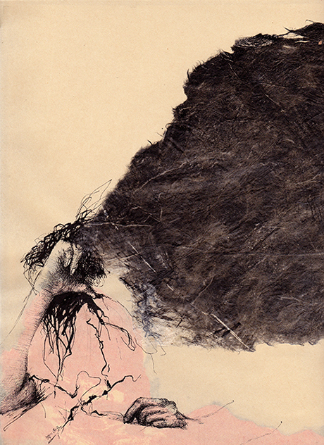 Mon travail gravé, dans le rouleau, accueille aussi la présence de l’oiseau. Elle s’actualise d’une relecture poétique et vivante, confrontant la matière volatile de toute vie à la pesanteur du destin et des éléments. De multiples motifs hermétiques se répètent et dialoguent tout au long de ce déroulé imaginaire. Devenu irréel et poétique, cet univers amène d’autres questionnements à notre monde contemporain auxquels participe le langage plastique (assemblage papier-image-couleur-texte-affabulation)…