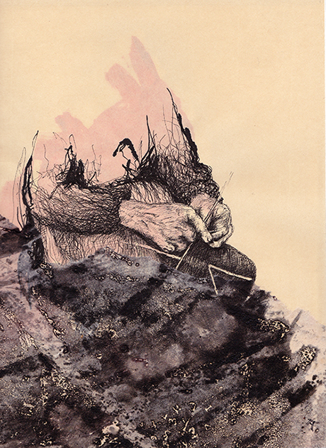 Une autre série s’est alors immiscée dans mon travail d’atelier; elle s’est imposée à moi comme une respiration, un pur travail de dessin sur le thème de la main : la main qui enserre, qui caresse, la main qui se repose ou qui travaille… bref, une main immémoriale, comme pour m’abstraire d’un lourd exercice en cours, qui me libère de toute temporalité, de toute exigence technique, et qui me laisse aux prises avec la simple ressource de l’encre et du papier.